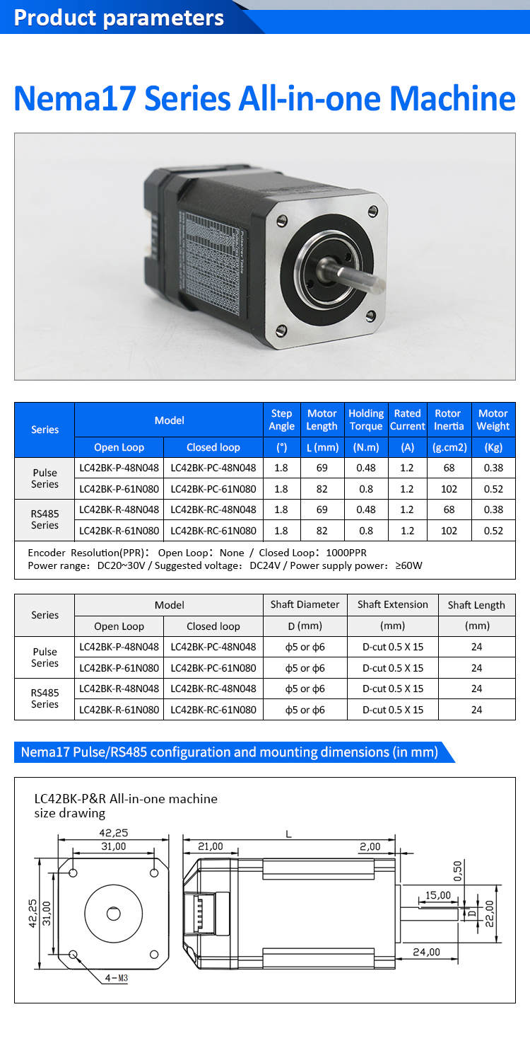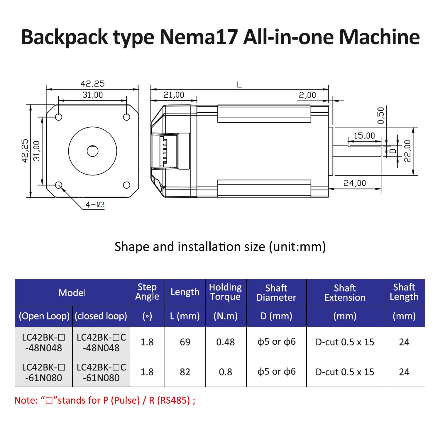 बॅकपॅक प्रकार NEMA17 ओपन लूप-बंद लूप इंटिग्रेटेड स्टेपर मोटर. ज्यामध्ये नाडी/आरएस 485 नियंत्रण आहे. नाडी/आरएस 485 सर्व-इन-वन अलार्म प्रोसेसिंग प्रोग्राम. लॉनोइझ आणि तापमान वाढीसह स्थिर ऑपरेशन, कोणतेही चरण तोटा समर्थन देत नाही. स्पेस-सेव्हिंग ऑल-इन-वन स्टेपर सिस्टम इंस्टॉलेशन सुलभ करते. फ्लेंज आकार: 42 मिमी. चरण कोन: 1.8 चरण कोन. टॉर्क 0.48/0.8n.m होल्डिंग. एन्कोडर रेझोल्यूशन (पीपीआर): ओपन लूप: काहीही नाही / बंद लूप: 1000 पीपीआर. उर्जा श्रेणी: डीसी 20 ~ 30 व्ही/सुचविलेले व्होल्टेज: डीसी 24 व्ही/वीजपुरवठा उर्जा: ≥60 डब्ल्यू. आम्ही मूळ फॅक्टरी आहोत, आमच्याकडे सीई, आरओएचएस प्रमाणपत्र आहे.